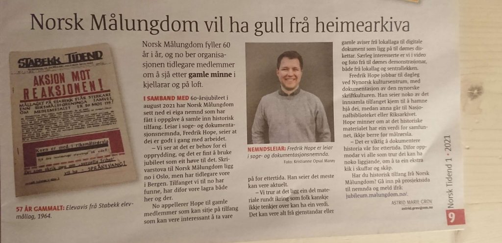 Norsk Målungdom blir 60 år i 2021, og har då bak seg seks tiår med målstrid, språkpolitikk og ungdomleg mobilisering. Til jubileet har vi sett oss eit mål om å få ordna arkiva våre og få til ei skikkeleg framstilling av soga til organisasjonen. Historia til og om NMU er lite dokumentert. Det er skrive fleire bøker om nokre av dei største lokallaga, som sjølvsagt gjev eit bilete av resten av samskipnaden. Men det finst ikkje ei større, samla framstilling av ungdomsorganisasjonen frå 1961 til tida vår.